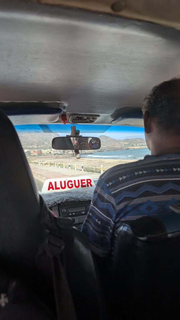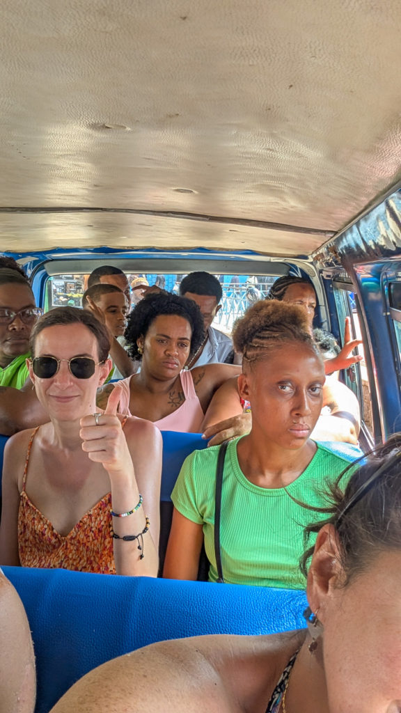Je vous recommande donc d’aller à la plage de Sao pedro, et pour cela il vous suffit de prendre un aluguer place Estrela. C’est un van qui, en théorie, accueille 12 personnes… mais en pratique, vous pouvez facilement vous retrouver à 20 dedans ! Pas d’horaires fixes : le van part quand il est plein. Soyez patient, ça reste assez rapide, et surtout c’est vraiment pas cher. Ah, ne cherchez pas : il n’y a pas de climatisation, comme quasiment partout au Cap-Vert. Et vous savez quoi ? C’est très bien comme ça. On s’habitue vite au climat, plutôt que de passer du chaud au froid en permanence. Un bon vieux ventilateur fait largement l’affaire !